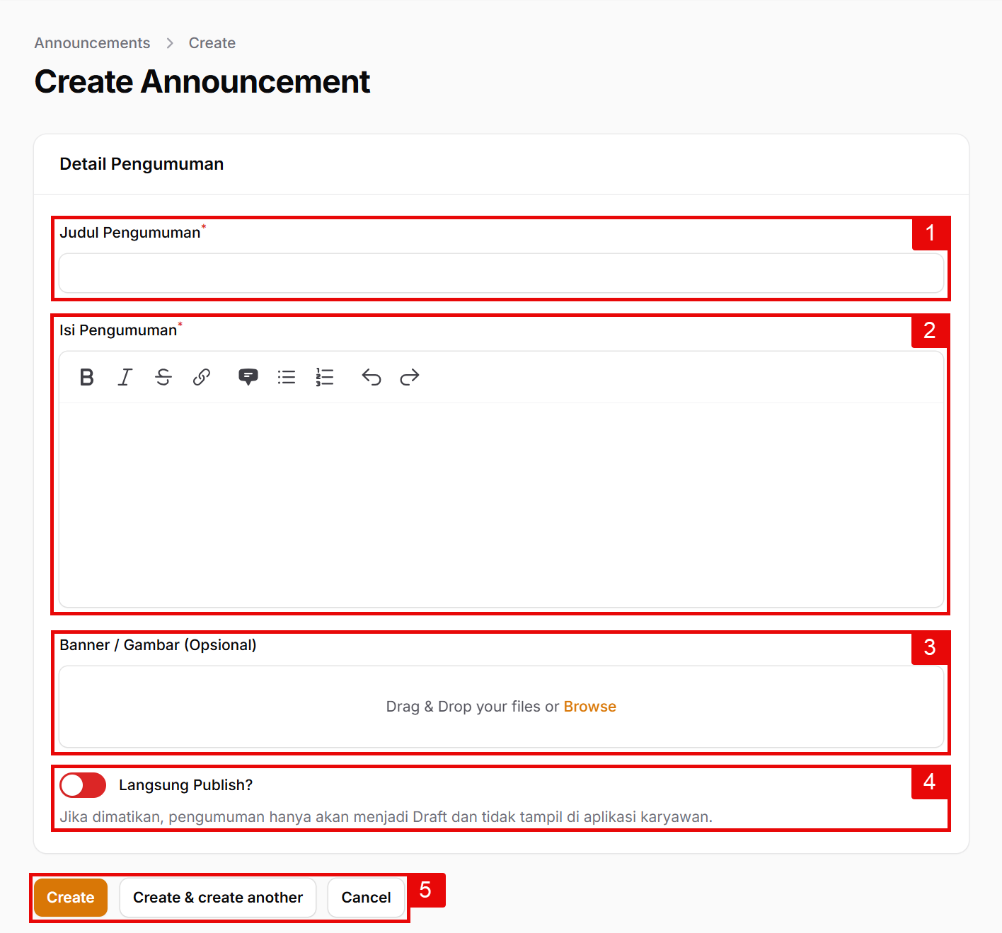 - 5. Tombol Aksi: * Klik Create untuk menyimpan pengumuman.