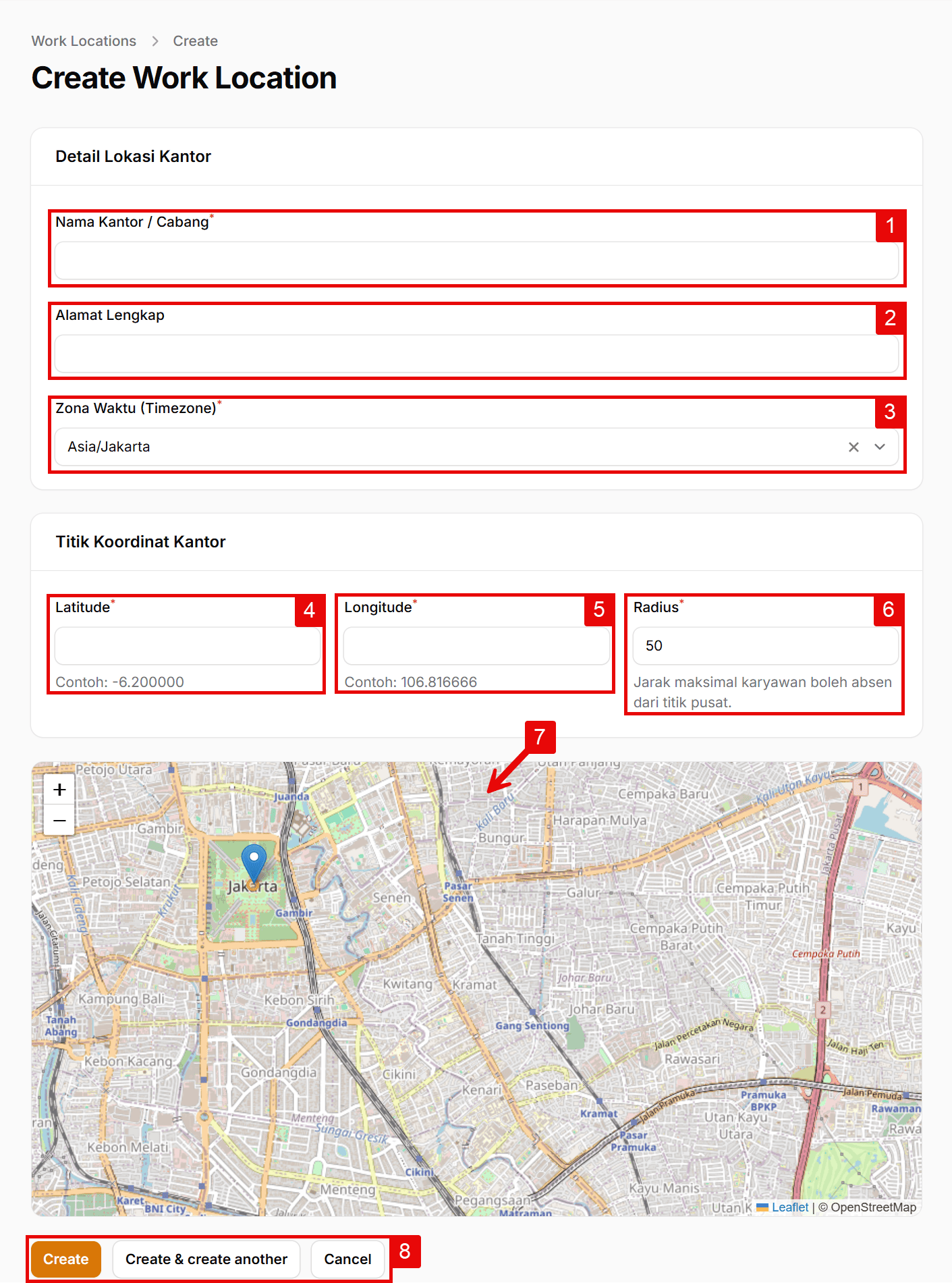 - 6. Radius: Tentukan jarak maksimal (dalam satuan meter) dari titik pusat koordinat di mana karyawan diizinkan untuk melakukan absen. (Contoh: ketik 50 untuk radius 50 meter dari titik kantor).