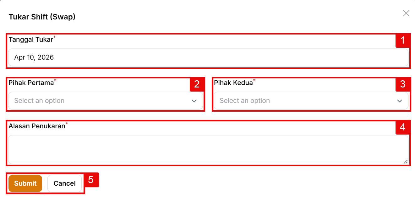 - 1. Tanggal Tukar: Tentukan pada tanggal berapa pertukaran shift ini dilakukan.