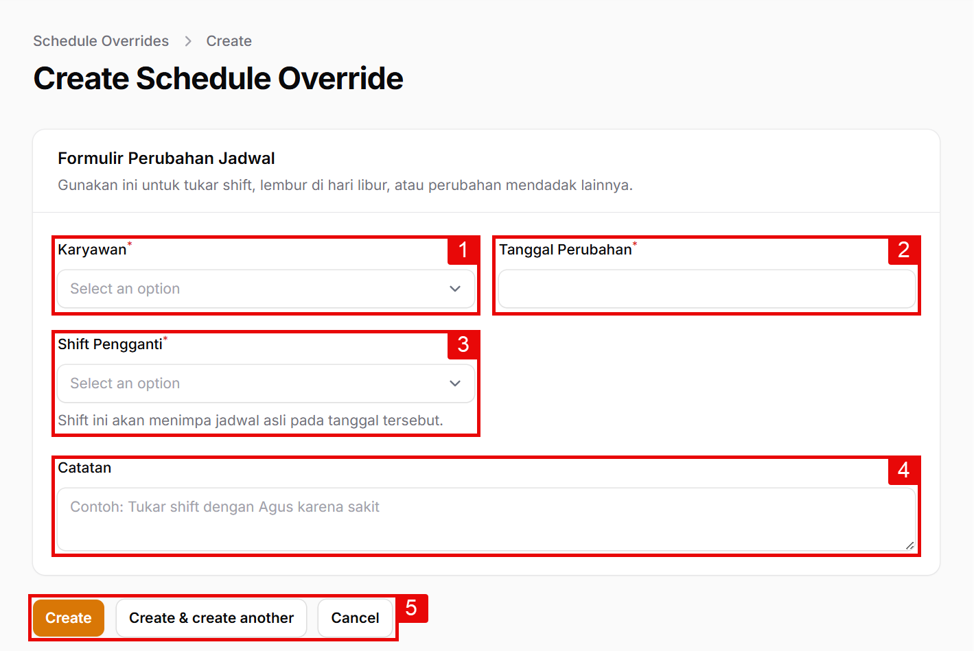 - 4. Catatan: Tuliskan alasan mengapa jadwal ini diubah sebagai dokumentasi HRD (Contoh: Menggantikan Agus yang sedang sakit, atau *Masuk lembur untuk stock opname).