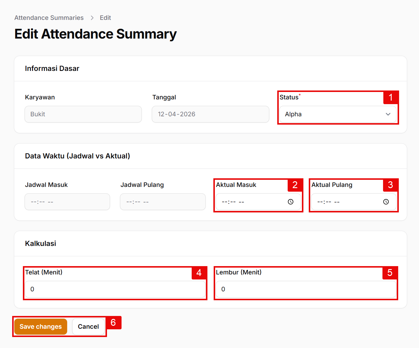 Klik tombol oranye 6. Edit pada baris absen yang bermasalah. Anda akan masuk ke halaman Edit Attendance Summary: