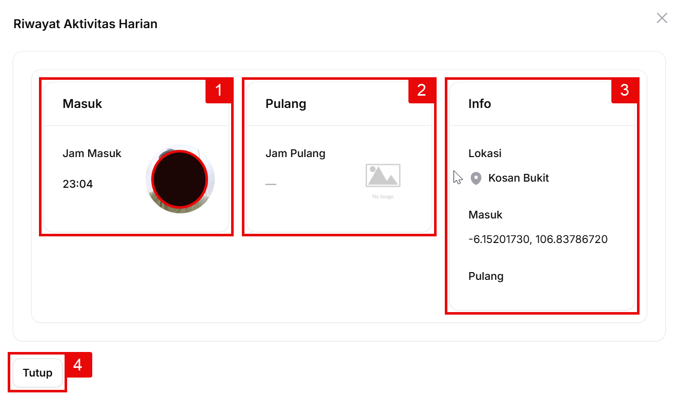 Klik tombol biru 5. Detail Sesi pada baris karyawan yang ingin Anda cek. Sebuah pop-up Riwayat Aktivitas Harian akan muncul: