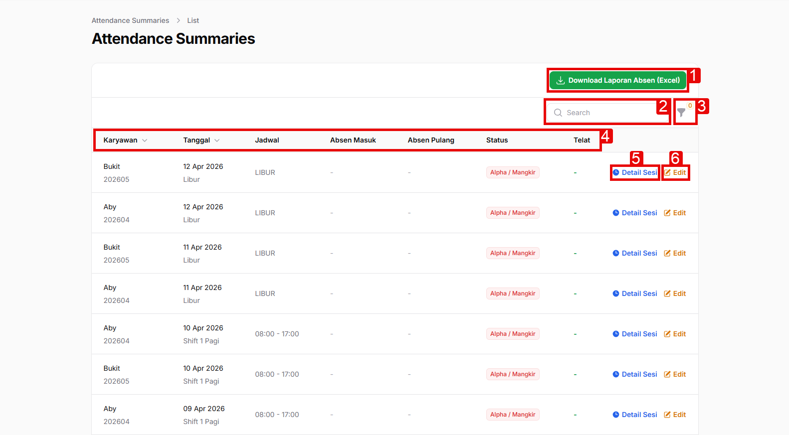 - 1. Download Laporan Absen (Excel): Tombol paling penting di akhir bulan! Klik tombol hijau ini untuk mengunduh seluruh data yang tampil di tabel ke dalam format file Excel. Sangat berguna untuk diolah lebih lanjut oleh tim Finance/Payroll.