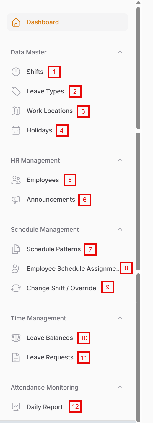 Menu navigasi di sebelah kiri layar adalah pusat kendali utama Kamu di aplikasi Absen Pintar. Melalui menu ini, Kamu dapat mengakses seluruh fitur pengelolaan sumber daya manusia, mulai dari pengaturan dasar (Data Master) hingga pemantauan laporan kehadiran. Berikut adalah rincian fungsi dari masing-masing menu:
