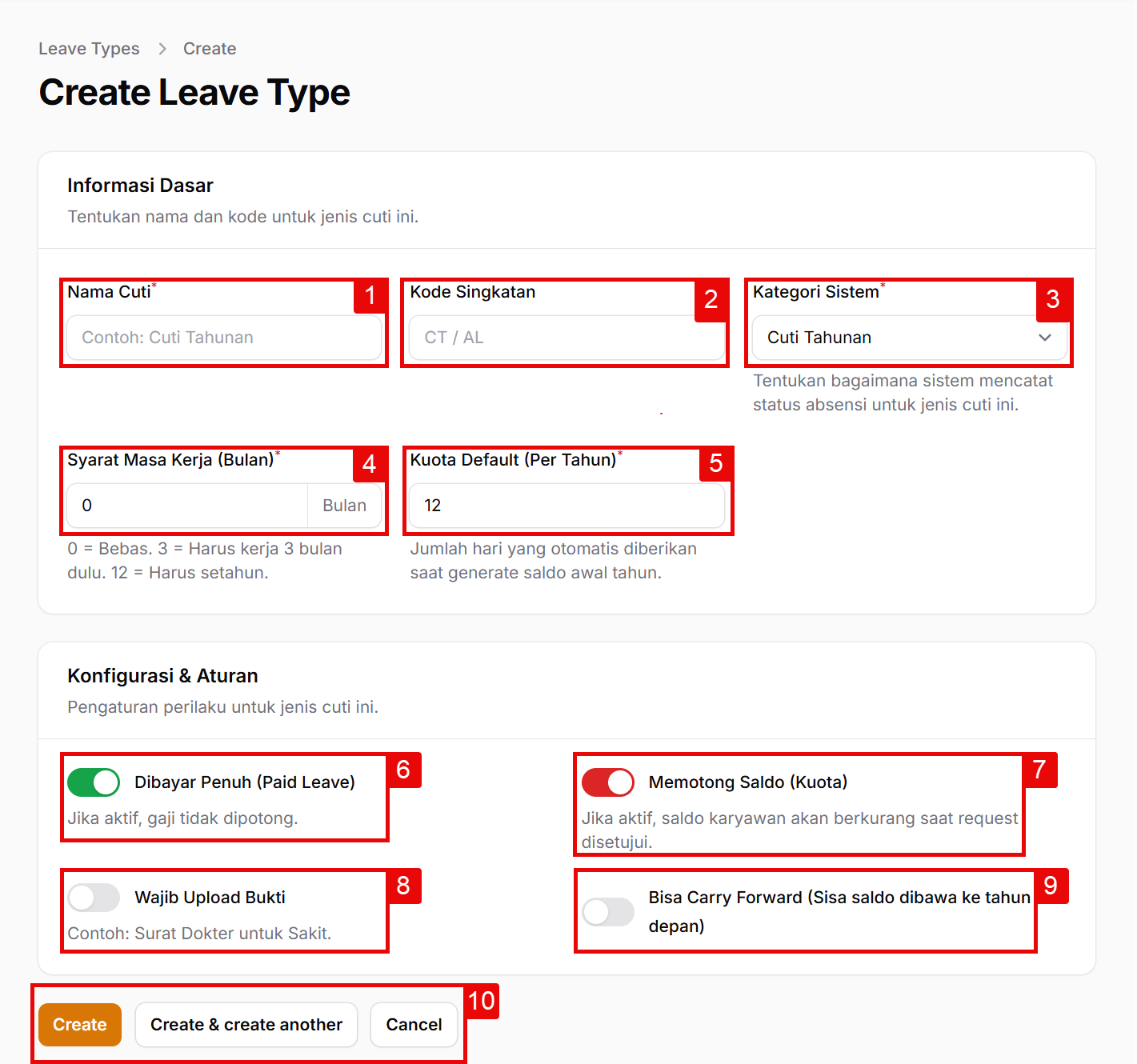 - 10. Tombol Aksi: Klik Create untuk menyimpan jenis cuti baru, atau Create & create another untuk langsung lanjut membuat jenis cuti lainnya tanpa harus kembali ke halaman depan.