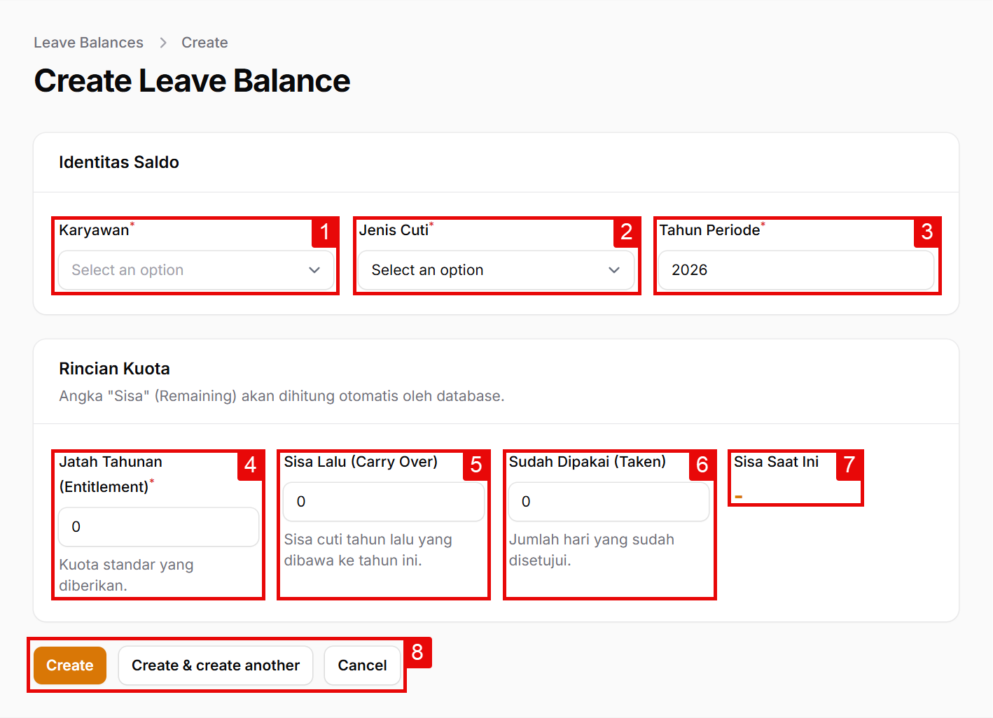 • 7. Sisa Saat Ini: Anda tidak perlu mengisi ini. Sistem akan otomatis menghitungnya menggunakan rumus: (Jatah Tahunan + Sisa Lalu) - Sudah Dipakai.