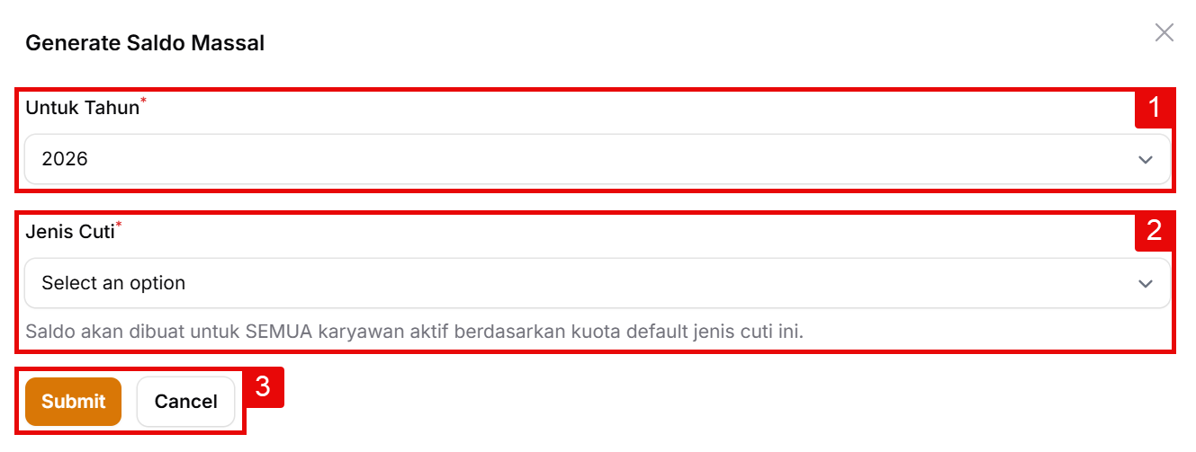 5. Catatan Sistem Penting: Saat Anda menekan tombol Submit (3), sistem akan secara otomatis membuatkan saldo sebesar kuota default (misal 12 hari) HANYA untuk karyawan aktif yang sudah memiliki penugasan jadwal kerja (Employee Schedule Assignments). Pastikan karyawan sudah diberikan jadwal sebelum Anda menekan tombol ini.